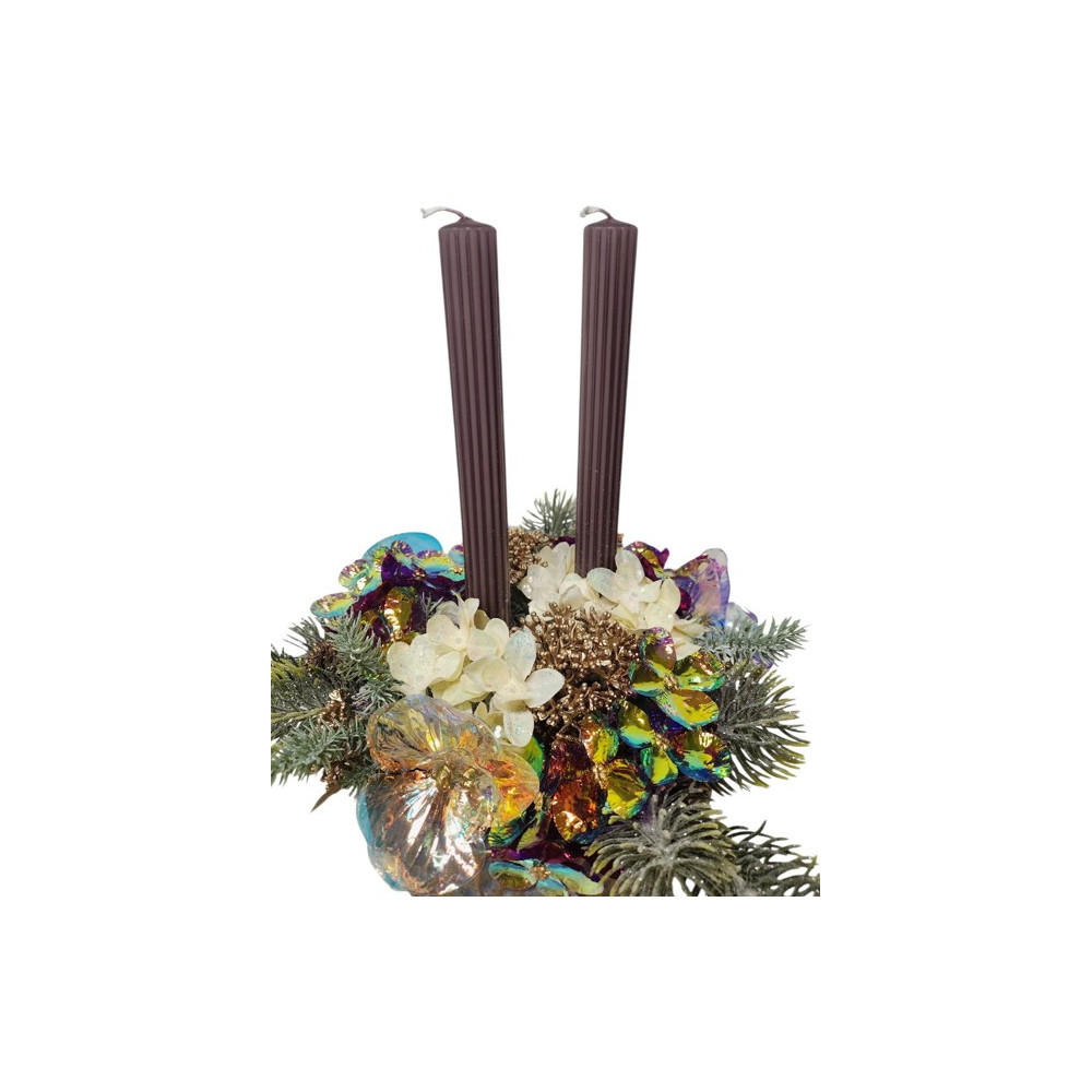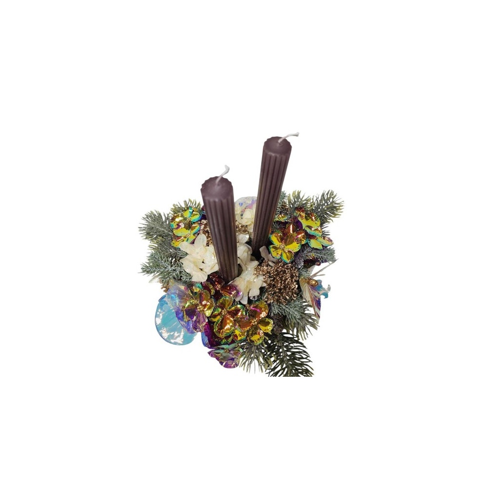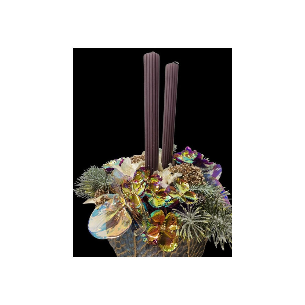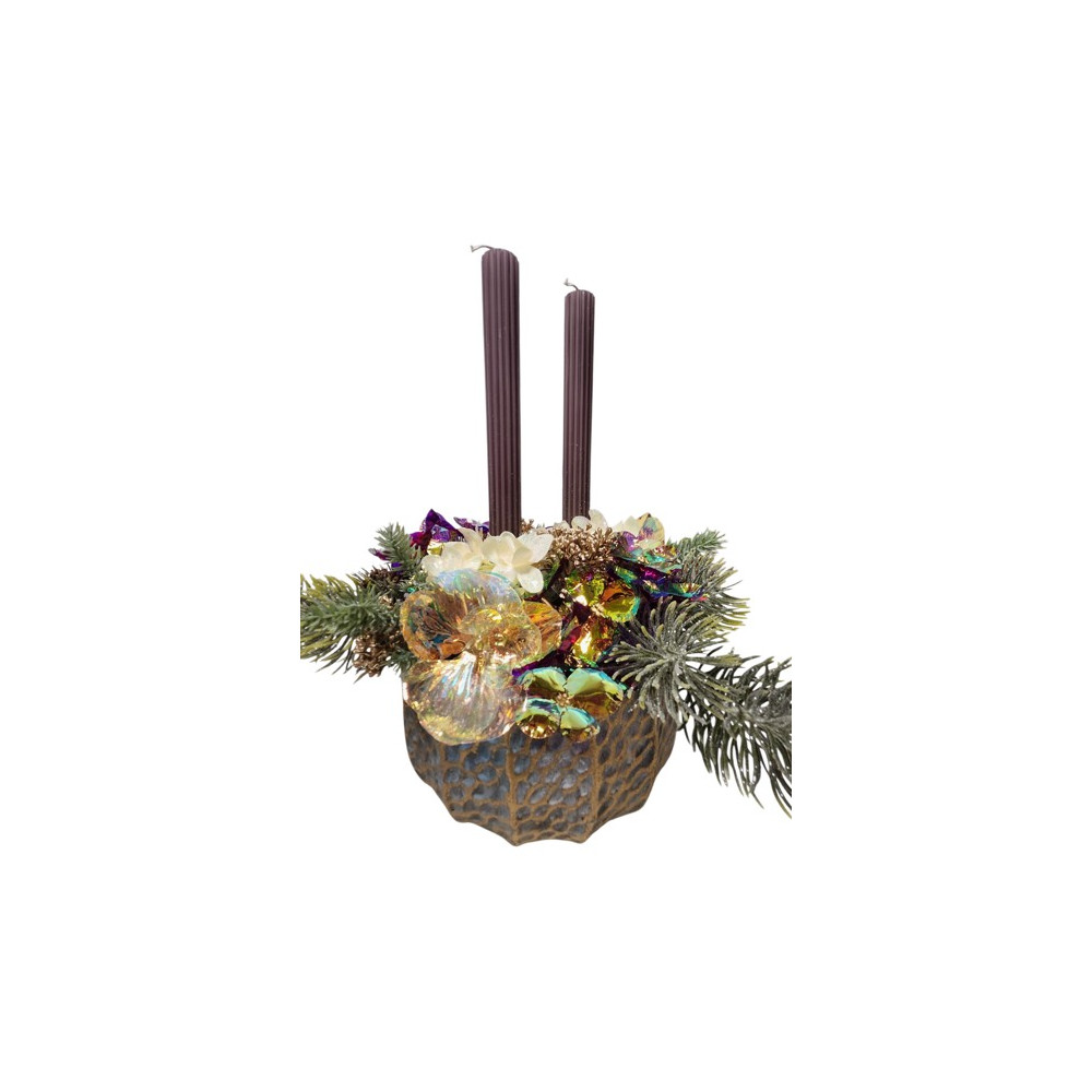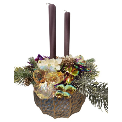 Vánoční, bohatě zdobený adventní svícen v betonové nádobě. Výška svíček 24cm, průměr nádoby 18cm.