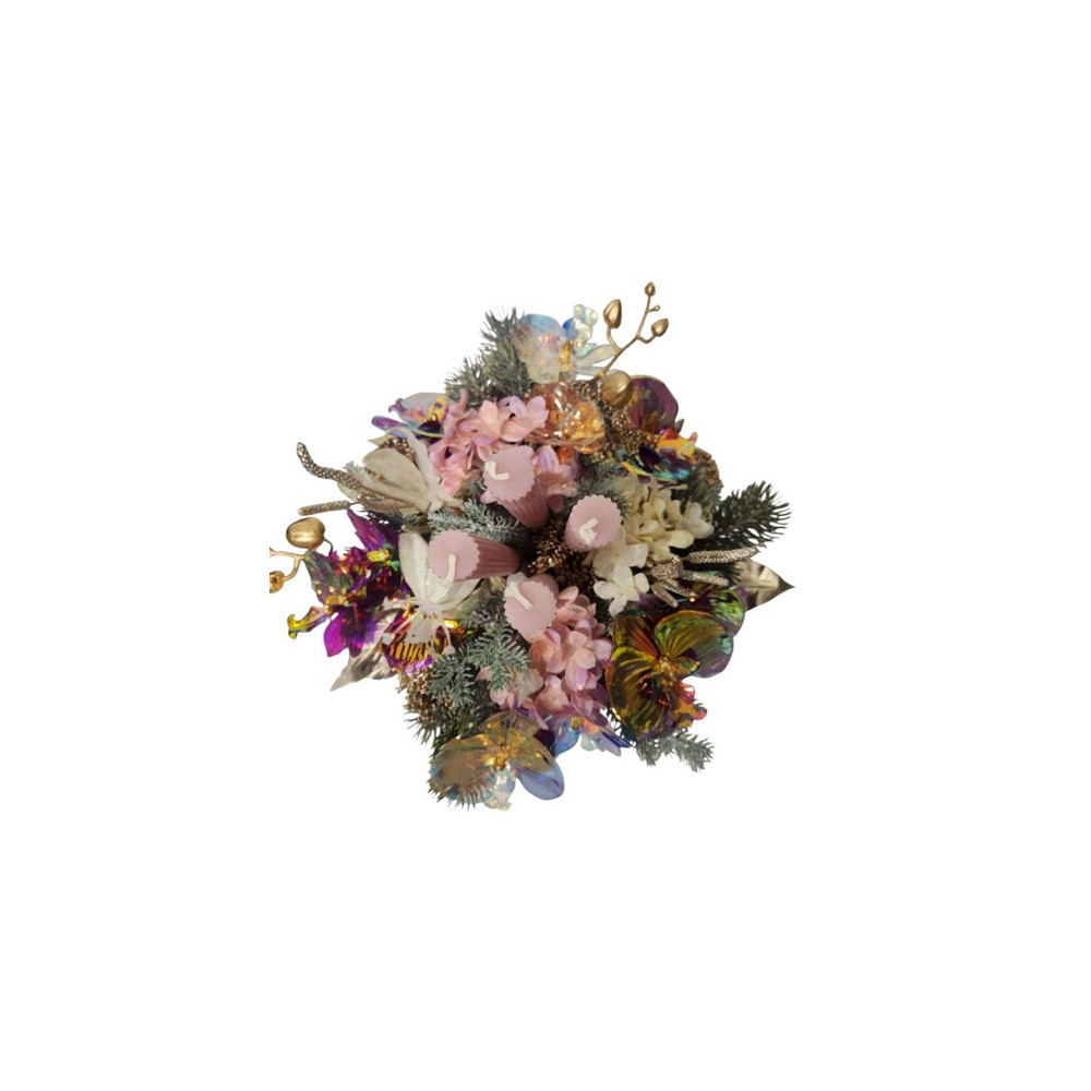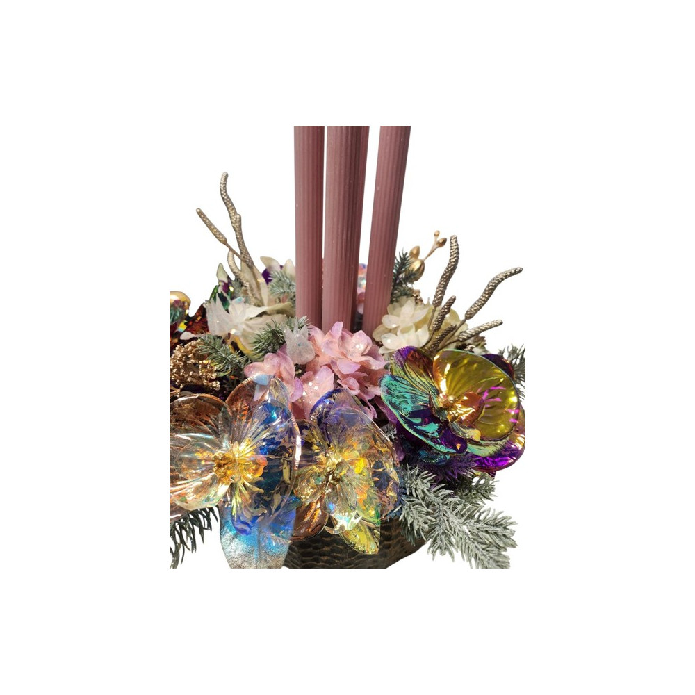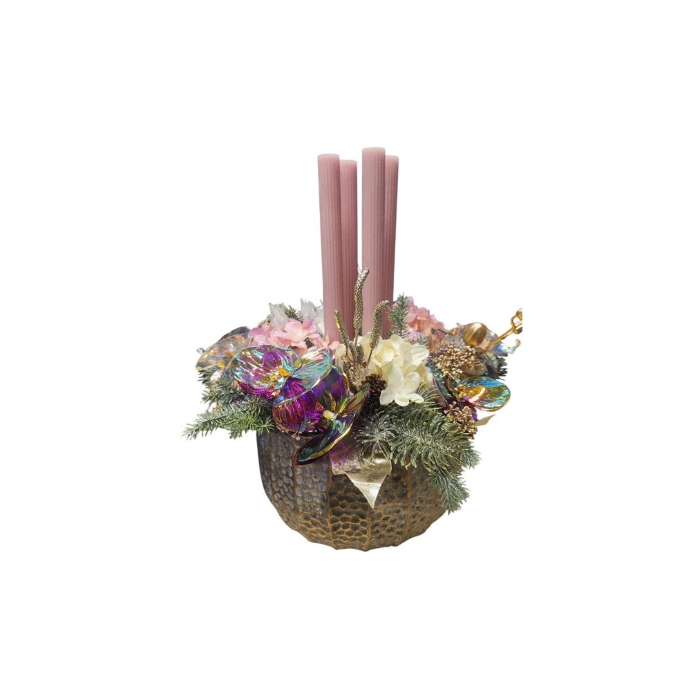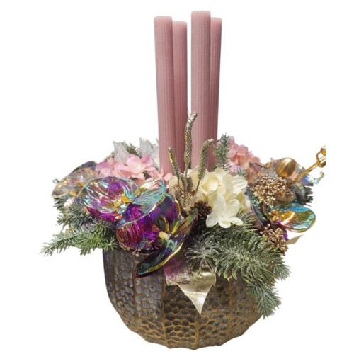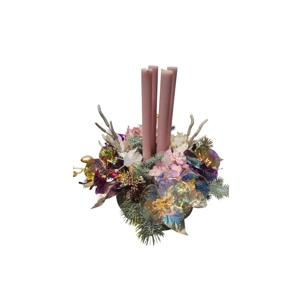 Vánoční, bohatě zdobený adventní svícen v betonové nádobě. Výška svíček 24cm, průměr nádoby 22cm.