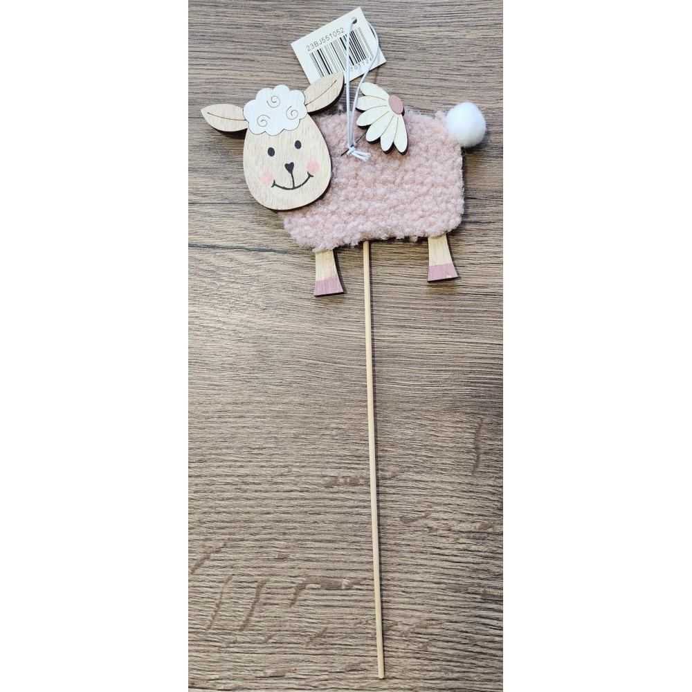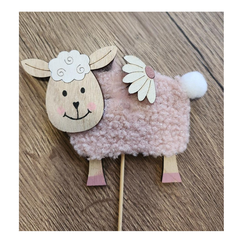 Dřěvěná ovečka s růžovou vlnou a kytičkou, 12cm.