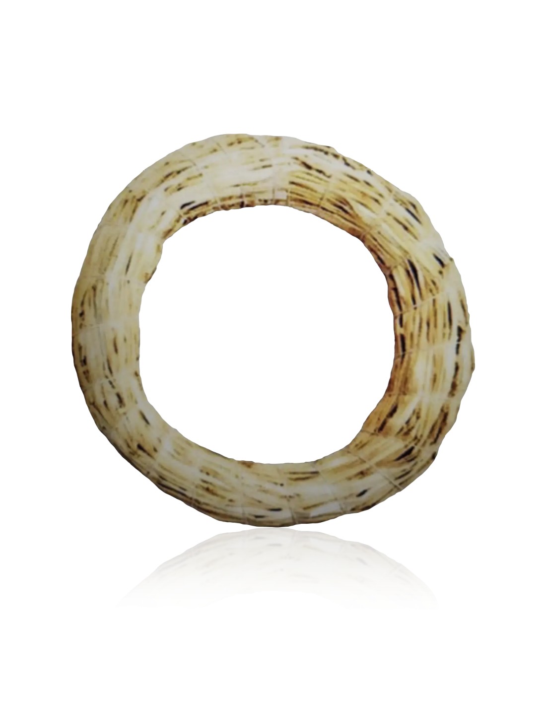 Slaměný kruh o průměru 20cm vyrobený z ovesné slámy, vázaný žlutou nití. Vhodný jako základ pro vazbu věnců.